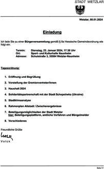 (--) Zu einer Bürgerversammlung gemäß hessischer Gemeindeordnung lädt der Stadtverordnetenvorsteher der Stadt Wetzlar, Udo Volck, für Dienstag, 23. Januar, um 17.30 Uhr in die Kulturhalle Naunheim (Schulstraße 3, 35584 Wetzlar) ein. Themen sind der städtische Haushalt 2024, die Solidaritätspartnerschaft mit Schepetiwka (Ukraine), die Stadtklimaanalyse, der Rahmenplan Altstadt sowie Bürgerbeteiligungsmöglichkeiten der Stadt Wetzlar wie Beteiligungsplattform, amtliche Verfahren und Mängelmelder. Alle Bürger sind eingeladen, sich aus erster Hand über diese Themen zu informieren.