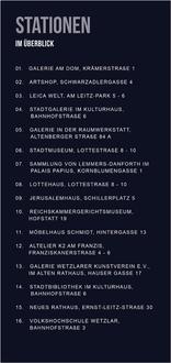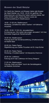 Ab 18 Uhr haben alle Galerien und Museen geöffnet und laden bei freiem Eintritt zu einem reichhaltigen Kultur-Angebot an Führungen, musikalischen Beiträgen, Kunstaktionen und Workshops ein. Außerhalb der Altstadt sind auch die Galerie des Neuen Rathauses, Ernst-Leitz-Straße 30, das Ernst-Leitz-Museum im Leitz-Park, die Galerie in der Raumwerkstatt, Altenberger Straße, und die Stadtgalerie im Kulturhaus, Bahnhofstraße 6, dabei, die alle im Halbstundentakt mit dem kostenlosen „Kunstshuttle“-Bus erreicht werden können.