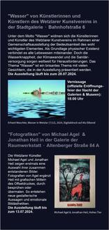 Eröffnet wird das Abendprogramm offiziell um 18 Uhr mit der Vernissage zur Ausstellung „Wasser“ des Wetzlarer Kunstvereins in der Stadtgalerie, Bahnhofstraße 6. Mehr als ein Dutzend Ausstellungen von international bekannten Künstlern wie Salustiano, Nikki Pelaez, Corjan Nodelijk, Werner Bischof und Emanuele Scorceletti bis hin zu heimischen Malern und Bildhauern bieten sich den Besuchern. In der Volkshochschule, Bahnhofstraße 3, findet von 18 bis 20 Uhr ein Mitmachangebot zum Arbeiten mit Acryl und urban Sketching statt.