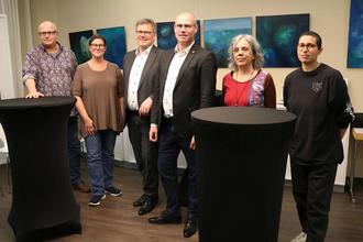v. l.: Gießens Oberbürgermeister Frank-Thilo Becher (SPD) und Wetzlars Kulturdezernent Jörg Kratkey (SPD) stellen in der Wetzlarer Stadtbibliothek die Förderprojekte des Kulturfonds Gießen-Wetzlar vor. Gefördert werden die Projekte von (v. l.): Stefan Lerach, Maren Bonacker, Martina Bodenmüller und Saloua Maskoué. (Foto: Stadt Wetzlar)