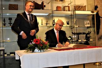 Dr. Wilhelm Wolf, im Juli 2022 zum Präsidenten des Staatsgerichtshofes des Landes Hessen gewählt, lobte die „Wetzlarer Gastfreundschaft“ und gab einen Einblick, warum er die Domstadt als Besuchsziel ausgewählt hatte. „Mir war wichtig, dass, neben dem Reichskammergericht, das einen starken historischen Bezug zu unserer jetzigen Aufgabe als Landes- und Bundesverfassungsgericht hat, eine Region in Hessen zu besuchen, die, wenn von wirtschaftlicher Entwicklung, Modernität und Dynamik gesprochen wird, nicht immer im Fokus steht. Wir haben die Tendenz, Hessen als das Rhein-Main-Gebiet wahrzunehmen. Aber wir haben eine enorm dynamische Region in Mittelhessen. Und ein Leuchtturm dieser Region ist Wetzlar“, stellte Dr. Wolf klar, bevor er und seine Kolleginnen und Kollegen sich zum Abschluss des Besuchs gemeinsam mit dem Magistrat in das Goldene Buch der Stadt Wetzlar eintrugen.