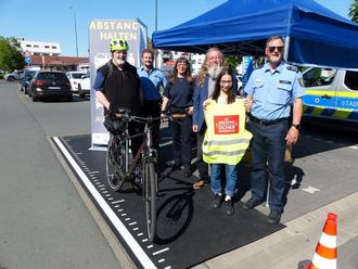 Über das Thema Sicherheit für Radfahrer im Straßenverkehr informierten Vertreter der Polizei, der Stadtpolizei und des städtischen „Koordinationsbüros Mobilitätswende“ bei einem Infostand auf dem Rewe-Parkplatz im Wetzlarer Westend am Montag, 12. Mai. Im Mittelpunkt stand der vorgeschriebene, sichere Abstand, der beim Überholen von Radfahrern erforderlich ist: 1,5 Meter. Umwelt- und Verkehrsdezernent Norbert Kortlüke (Grüne) betonte dabei, wie wichtig es angesichts zunehmenden Radverkehrs sei, die vorgeschriebenen Abstandsregeln beim Überholen einzuhalten.