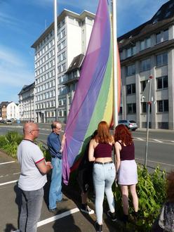 Vor dem Rathaus hissten Aktive des Jugendforums eine „Regenbogenfahne“, links Stadtrat Jörg Kratkey. (Fotos: Stadt Wetzlar).