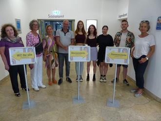 Zusammen mit Kommunalpolitikern weihten Vertreter des Jugendforums die Gendertoiletten ein: v.l. Renate Pfeiffer-Scherf (FW), Petra Strehlau (Grüne), Sandra Ihne-Köneke (SPD), Stadtrat Jörg Kratkey (SPD), drei Mitwirkende des Jugendforums, Oliver Huttel (Jugendamt) und Dunja Boch (FW)