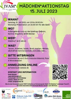 Mädchen ab 9 Jahren haben dabei die Möglichkeit, einen Tag lang Workshops und Aktionen wie Latin Dance, Musik machen, Gläser designen und alkoholfreie Sommercocktails herstellen, Malen auf Leinwand, Nagelbilder usw. auszuprobieren. Um 16 Uhr ist eine Abschlusspräsentation der Workshops geplant, zu der Gäste eingeladen sind. Bei Dauerregen fällt die Veranstaltung aus.