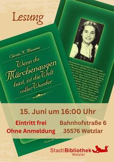Zu einer Lesung mit der Wetzlarer Autorin Christa Maxeiner aus ihrem Buch „Wenn du Märchenaugen hast, ist die Welt voller Wunder“ lädt die Stadtbibliothek Wetzlar (Bahnhofstraße 6) am Samstag, 15. Juni, um 16 Uhr ein. Es handelt sich um einen eindrücklichen Zeitzeugenbericht über die Kindheit in einem Dorf in der Weichselniederung, die Flucht vor den Russen im Januar 1945 und die Nachkriegszeit in Berlin. Die 87-jährige Autorin lebte seit 1959 in Wetzlar und seit 1990 in Kanada. Sie ist Patenkind von Charlotte Bamberg (1903-1985), der langjährigen Oberin des Diakonissen-Mutterhauses der Königsberger Diakonissen. Der Eintritt ist frei.