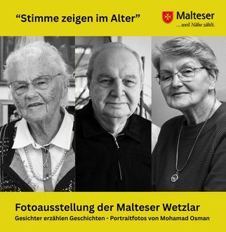 Zur Eröffnung einer Fotoausstellung der Malteser Wetzlar mit dem Titel „Stimme zeigen im Alter - Portraitfotos von Mohamad Osman” lädt die Stadt Wetzlar am Dienstag, 24. Juni, um 17:30 Uhr ins Neue Rathaus, Ernst-Leitz-Straße 30, ein. Die 20 großformatigen schwarz-weißen Porträtfotos von Senioren sind im Rahmen eines Foto-Projekts mit Bewohnern der Senioren-Wohnanlagen in Hermannstein und Arnsburger Gasse Wetzlar entstanden. Nach dem Rathaus geht die Schau auf Wanderschaft: vom 4 Juli bis 3. August in der Stadtbibliothek Wetzlar, vom 12. September bis 3. November im Altenzentrum Pariser Gasse und vom 7. November bis 8. Dezember im Dom Wetzlar.