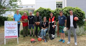 Blicken mit Vorfreude auf das Sommerferienprogramm für Kinder und Jugendliche: Brian Cowley (Abteilungsleiter Jugendbildung), Stadtjugendpfleger Reiner Arnold, Michael Krayl vom RSV Lahn-Dill, Oberbürgermeister Manfred Wagner, die Malteser, Dieter Dörfler (Sportjugend Hessen) und Thorsten Bender (Jugendamtsleiter). (Foto: Stadt Wetzlar)