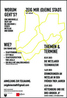 im Rahmen des diesjährigen Kulturfonds Gießen-Wetzlar wurden auch die etwas anderen Stadtführungen bzw. das Konzept von der Performance-Künstlern Saloa Maskoue gefördert. Bei diesen Stadtführungen geben „Locals“ aus Gießen und Wetzlar Einblicke in das Stadtleben. Die Stadtführungsreihe unter dem Titel „Zeig mir (d)eine Stadt“ handelt auch ein Stückweit über die Beziehung beider Nachbarstädte.