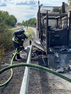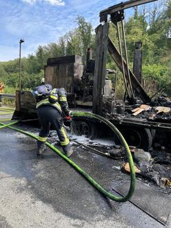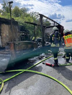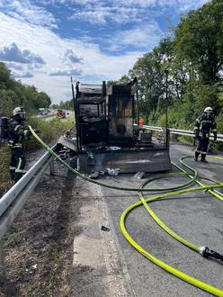 Im Baustellenbereich der B49 in Höhe Dorlar ist heute der Auflieger eines Baustellen LKWs in Brand geraten. Der Auflieger war mit Material und einem Teerkessel beladen und brannte komplett aus. Ein Übergreifen der Flammen auf die Zugmaschine konnte verhindert werden. Auch eine weiter Ausbreitung auf die Böschung konnte rechtzeitig gestoppt werden. Da umliegende Straßen wegen der Baustelle am Dorlarer Kreisel gesperrt sind und es sich um die Richtungsfahrbahn nach Limburg handelte war auch die Berufsfeuerwehr Giessen vor Ort. Um die Löschwasserversorgung sicherzustellen war neben dem Wetzlarer Abrollbehälter mit 10.000 Liter Wasser auch das Fahrzeug aus Ehringshausen vor Ort. Wieder einmal ein Einsatz, bei dem sich das Containerkonzept zur Löschwasserversorgung bewährt hat. Wir haben 3 Trupps unter Atemschutz und drei C-Rohre eingesetzt.