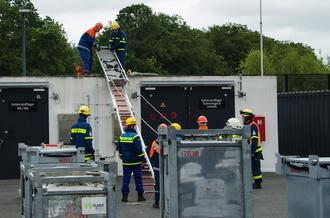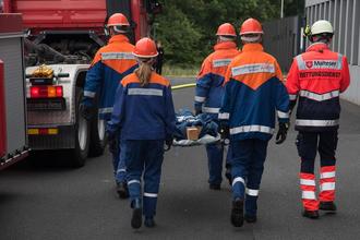 Die Floriansjüngers stellten vor Ort fest, dass sich aufgrund von Sanierungsmaßnahmen Rauch und Feuer bereits im Gebäude ausgebreitet haben. Mehrere Mitarbeiter sind in verschiedenen Gebäudeteilen eingeschlossen und können sich nicht selbstständig retten. Durch eine defekte Belüftungsanlage breitet sich das Feuer mittels Kamineffekt auch in den Bereich der Anlieferung und des Gefahrstofflagers aus, so zumindest das Übungsszenario der Großübung am vergangenen Samstagmittag.