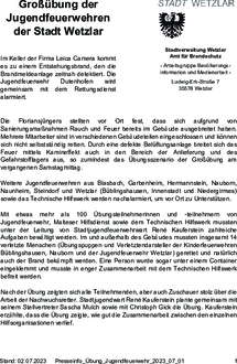 Weitere Jugendfeuerwehren aus Blasbach, Garbenheim, Hermannstein, Nauborn, Naunheim, Steindorf und Wetzlar (Büblingshausen, Innenstadt und Niedergirmes) sowie das Technische Hilfswerk werden nachalarmiert, um vor Ort zu Unterstützen.