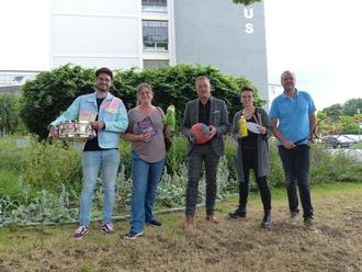 Vom Schlagzeugschnupperkurs bis zum Tennistraining: Mario Gwiazdowski (Musikschule Noice Academy), Maren Bonacker (Phantastische Bibliothek), Oberbürgermeister Manfred Wagner, Christin Eichler und Brian Cowley (Jugendförderung) präsentieren das Spektrum der Ferienspiele (Foto: Stadt Wetzlar)