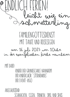 Herzliche Einladung zum Familiengottesdienst „Endlich Ferien - leicht wie ein Schmetterling“ mit Taufe und Reisesegen am 16. Juli um 10.00 Uhr mit Pfr. Andreas Engelschalk, Kinderchor Sternenkids, Kinder der Grundschule Naunheim und dem Event-Kigo-Team.