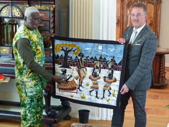 Alain Bako von der Entwicklungsorganisation ODE dankte Oberbürgermeister Wagner mit einem Batik aus Burkina Faso (Fotos: Stadt Wetzlar)