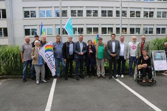 Zusammen mit Mitgliedern des Wetzlarer Friedenstreffs sowie Vertretern der katholischen und evangelischen Kirche und aus der Politik hat Wetzlars Oberbürgermeister Manfred Wagner (SPD) am Montag (8. Juli) am Neuen Rathaus eine Flagge der Kampagne „Mayors for Peace“ („Bürgermeister für den Frieden“) gehisst und damit ein Zeichen gegen den Einsatz von Atomwaffen gesetzt.