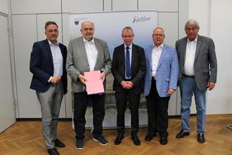 Für 40 Jahre Ehrenamt geehrt: Der Geehrte Helmut Kräuter (2.v.l) mit v.l. Wetzlars Oberbürgermeister Manfred Wagner, Amtsgerichtsdirektor Dr. Achim Lauber-Nöll sowie den Magistratsmitgliedern Bernhard Noack und Karlheinz Kräuter. (Foto: Stadt Wetzlar)