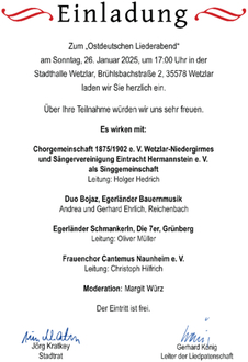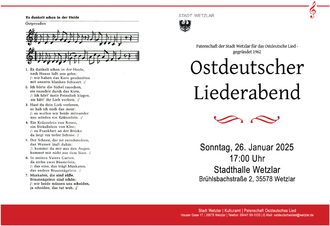 Die Stadt Wetzlar lädt im Rahmen ihrer „Patenschaft für das Ostdeutsche Lied“ am Sonntag, 26. Januar, um 17 Uhr zu einem Ostdeutschen Liederabend in die Stadthalle (Brühlsbachstraße 2) ein. Es wirken mit: die Egerländer Schmankerln aus Grünberg, die Chorgemeinschaft 1875/1902 Wetzlar-Niedergirmes und Sängervereinigung Eintracht Hermannstein, das Duo Bojaz (Egerländer Bauernmusik) und der Frauenchor Cantemus Naunheim. Moderiert wird die Veranstaltung von Margit Würz. Der Eintritt ist frei.