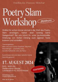 (--Ein Poetry-Slam-Workshop findet im Rahmen des Werther-Jubiläums am Samstag, 17. August, von 11 bis 16 Uhr Stadtmuseum Wetzlar, Lottestraße 8-10, statt. Unter Anleitung von Stefan Dörsing können Texte kreiert und vorgestellt werden. Themengebiete können sich aus Goethes „Werther“ speisen wie unerfüllte Liebe, Gesellschaftskritik oder Natur. Aber auch andere Themen sind möglich.