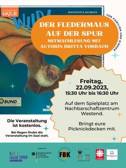 Die städtische Jugendarbeit Wetzlar-Westend und das Familienzentrum der Caritas laden für Freitag, 22. September, um 15:30 Uhr zu einer Lesung für Familien auf den Spielplatz am Nachbarschaftszentrum (Horst-Scheibert-Str. 2) ein. Gelesen wird eine Tier-Abenteuergeschichte mit Sachwissen aus dem Kinderbuch „WILD! Die Fledermaus“ von Britta Vorbach und Annett Stütze.