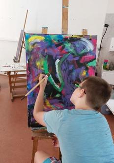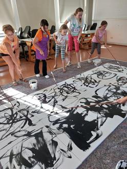 an denen individuell an Staffeleien weitergearbeitet wurde. Paul Jackson Pollock, ein US-amerikanischer Maler und ein bedeutender Vertreter des abstrakten Expressionismus der New York School, diente den Teilnehmern als Vorbild. Pollock wurde bekannt mit der von ihm gegründeten Stilrichtung des Action Painting. Neben den Arbeiten an den großen Leinwänden durften die Kinder mit verschieden Übungen wie Malen nach Musik, Murmelbildern, eine Geschichte malen oder mit abstrakten Formen arbeiten, ihren künstlerischen Fantasien Raum geben. Die Veranstaltung war eine Kooperation mit dem Wetzlarer Kunstverein und der vhs Wetzlar und wurde durch das Aktionsprogramm "Aufholen nach Corona" gefördert.