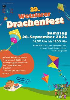 Zum 29. Mal findet zum Herbstanfang am Samstag, 28. September, von 14 bis 18 Uhr das Drachenfest in Niedergirmes statt. Das Kinder- und Familienfest spielt sich wie üblich auf der Lahnwiese bei der Sporthalle der August-Bebel-Gesamtschule ab. Es wird im Rahmen der Kinderkulturtage von der städtischen Jugendförderung Wetzlar und dem Jugendzentrum Girmeser Villa veranstaltet, beteiligt sind Institutionen und Vereine aus Niedergirmes. Geboten werden wieder Kinderschminken und Basteln für Groß und Klein. Höhepunkt ist das Drachen steigen lassen. Wer einen beschädigten Drachen zuhause hat, kann sich beim „Drachendoktor“ Hilfe suchen. Für Speisen und Getränke ist gesorgt, gerne können auch eigene Picknickdecken mitgebracht werden. Alle weiteren Informationen sind dem Flyer zu entnehmen, dieser ist zu finden auf www.wetzlar.de oder auch auf Instagram @jukiwetzlar.