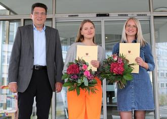 Jahrgangsbeste (v.l.): Bürgermeister Andreas Viertelhausen (FW) gratuliert Marie Hanold (B.A. Public Administration) und Kim Luisa Steiner (Verwaltungsfachangestellte) zu ihren Bestnoten. (Fotos: Stadt Wetzlar)