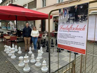 Mit einer letzten Schachpartie haben ehrenamtliche Helfer des Seniorenbüros die diesjährige Freiluftschachsaison in der Bahnhofstraße abgeschlossen. Das Seniorenbüro der Stadt Wetzlar dankte Michael Nagel und Nina Schabunina, die den Spielbetrieb in diesem Jahr betreut haben. Bei gutem Wetter konnten dort zahlreiche Partien gespielt werden. Die Schachfiguren werden nun eingelagert und kommen voraussichtlich ab Juni 2025 erneut zum Einsatz.