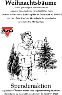 Der diesjährige Weihnachtsbaumverkauf des CVJM findet am 14. Dezember von 09.00-12.00 Uhr auf dem Schulhof der Grundschule Naunheim statt. Verkauft werden Nordmanntannen zu handelsüblichen Preisen. Der Erlös ist für die Finanzierung der Jugendmitarbeiterstelle bestimmt.