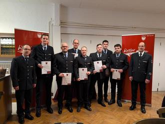 von links nach rechts: Philipp Schmidt (stv. Wehrführer), Christph Gick (Wehrführer), Dennis Tiegs, Julian Gick, Julian Naumann, Pascal Hörbel, Niklas Schuster, Dean-Bastian Martin, Thorsten Kraft (stv. Amtsleiter der Feuerwehr Wetzlar)