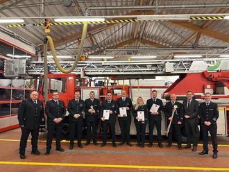 Feuerwehr Wetzlar, v.l.: Dirk Schmidt (Sprecher ehrenamtliche Kräfte), Patrick Bauer (stv. Wehrführer), Stefan Böhm (stv. Wehrführer), Markus Klauer (meiste Einsätze 2025), Till Heller (Oberlöschmeister), Luca Liesen (Hauptfeuerwehrmann), Lea Köhler (Hauptfeuerwehrfrau), Maximilian Jung (Oberlöschmeister), Heiner Mehl ( Ein-Meter-Kochlöffel am Bande), Manfred Wagner (Oberbürgermeister), Christian Failing (Wehrführer)