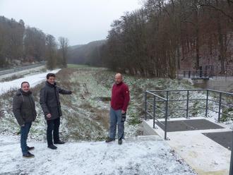 Tiefbauamtsleiter Sven Torben Tropp, Bürgermeister Viertelhausen und Ortsbeiratsmitglied Andreas Ebertz freuen sich über das neue Rückhaltebecken (Foto: Stadt Wetzlar)