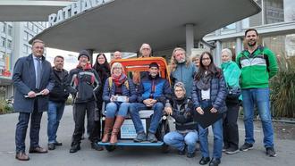 Freuen sich über ein gelungenes Projekt: Oberbürgermeister Wagner (l.), Mobilitätsdezernent Kortlüke (5.v.r.), Vertreter von ADFC, Stadtverwaltung, Seniorenheimen und Piloten (Foto: Pascal Reeber)