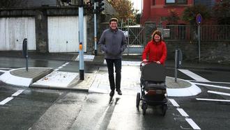 Testen die neue Fußgängerampel in der Bergstraße: Eine Anwohnerin und Bürgermeister Andreas Viertelhausen (FW). (Foto: Stadt Wetzlar)