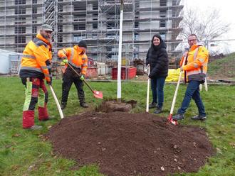Stadträtin Andrea Biermann und Amtsleiter Markus Biniarz (r.) griffen zusammen mit Mitarbeitern des Stadtbetriebsamtes zur Schaufel, um eine Winterlinde einzupflanzen (Foto: Stadt Wetzlar)
