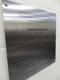Im Wetzlarer Stadtteil Münchholzhausen wurde die örtliche Sporthalle an der Schulstraße in „Helmut-Brückmann-Sporthalle“ benannt. Oberbürgermeister Manfred Wagner (SPD), Bürgermeister Andreas Viertelheuasen (FW) und Ortsvorsteher Jörg Schneider (CDU) enthüllten am Mittwoch, 11. Dezember, einen Schriftzug und eine Gedenktafel, die an den früheren Münchholzhäuser Ortsvorsteher Helmut Brückmann (1979-1993) erinnert, der in diesem Jahr 100 Jahre alt geworden wäre. Wagner nannte Brückmann einen „Gestalter“ mit vielfältigen kommunalpolitischen Funktionen, dem Münchholzhausen viel zu verdanken habe. Ortsvorsteher Schneider hob die 37-jährige Tätigkeit Brückmanns als Vorsitzender des Turnvereins Münchholzhausen (TVM) hervor, bei er maßgeblich am Bau der Turnhalle mitgewirkt habe. Auch das Bürgerhaus in Münchholzhausen gäbe es ohne ihn nicht, so Schneider. Die Einweihung fand im Rahmen der Weihnachtsfeier des Turnvereins statt und bildete den Abschluss des Jubiläumsjahres „1.250 Jahre Münchholzhausen“.