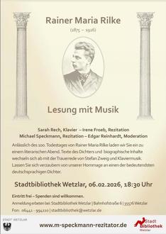 Anlässlich des 100. Todestages von Rainer Maria Rilke (1875 - 1926) lädt die Stadtbibliothek Wetzlar, Bahnhofstraße 6, 35576 Wetzlar am Freitag, 6. Februar 2026, um 18:30 Uhr zu einem literarischen Abend ein - einer Hommage an einen der bedeutendsten deutschsprachigen Dichter.