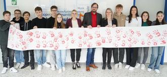 Nach einer kurzen Begrüßung durch Schulleitungsmitglied Dr. Matthias Zipp übertrug dieser das Wort zunächst an Schülerin Henrike Koscharre (Q2) und Schüler Bjarne Rölke (8G3), die im Namen der SV eine Tapetenrolle mit roten Handabdrücken an die Abgeordnete des Deutschen Bundestags und Beauftragte der Bundesregierung für Aussiedlerfragen und nationale Minderheiten übergaben. Sie wiesen darauf hin, dass vor einigen Wochen rund 600 Schüler und Lehrkräfte der Schule am „Red Hand Day“ teilgenommen haben und mit roten Handabdrücken ein Zeichen gegen den missbräuchlichen Einsatz von Kindern und Jugendlichen als Soldaten in Kriegsgebieten gesetzt haben. Pawlik bedankte sich und versprach, sich auch in Zukunft gegen den Einsatz von Kindersoldaten einzusetzen.