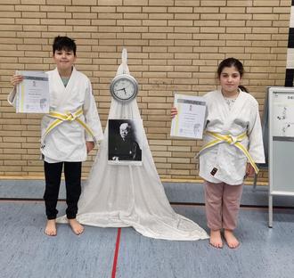 Mustafa und Giorgia mit bestandener Prüfung zu Weiß-Gelb.