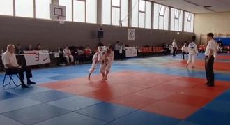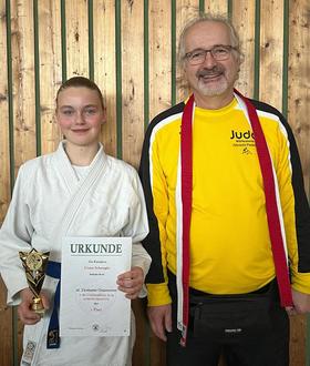 Ko-uchi-gari. Kleine Innensichel. Wazaari (1/2 Punkt). Und dann noch 10 Sekunden festhalten. Ippon (Dauer 30 Sekunden)