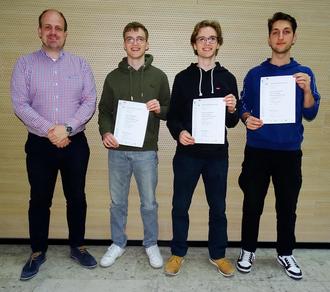Bildunterschrift: Das Siegerteam mit ihrem Leistungskurslehrer Dr. Jan Hofmann.