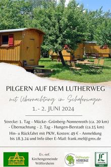 Am 1. und 2. Juni 2024 sind wir unterwegs auf dem Lutherweg (Mücke-Grünberg-Nonnenroth-Hungen-Berstadt) mit einer Übernachtung in der Schäferwagenherberge in Nonnenroth. Anfragen zur Tour, ggf. auch nur zur Anmeldung für eine Tagesetappe bitte an E-Mail: frank.mel@gmx.de
