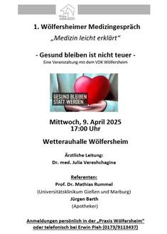 Da das Thema Gesundheit eine immer wichtigere Rolle spielt haben wir in Zusammenarbeit mit der Praxis Wölfersheim und der Medizinischen Klinik IV aus Gießen eine Informationveranstaltung zu diesem Thema geplant.