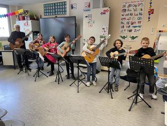 Am letzten Schultag vor den Osterferien boten 2 der 4 Gitarrenkurse im Jahrgang 3 der Jim-Knopf-Schule unter der Leitung von Dr. Jörg Limper und von Thomas Gerlach noch ein kleines Konzert für die Eltern und Angehörigen im Musiksaal der Schule. Der 1. Vorsitzende des Fördervereins und ehemalige Schulleiter Gerlach begrüßte die zahlreich erschienenen Eltern und Angehörigen und erläuterte noch einmal das musikalische Konzept des Fördervereins, der den Kindern der Grundschule die Instrumente Geige, Cello, Perkussion und Gitarre in seinen Instrumentalkursen erfolgreich nahebringt. Diese Förderung wird im Jahrgang 5 der Singbergschule dann später fortgesetzt. Mit großer Begeisterung und beachtlichem Können demonstrierten die Schülerinnen und Schüler Beispiele aus Klassik, Volksliedgut und Pop, die im wöchentlichen Gitarrenkurs erarbeitet wurden. Großer Beifall und lautstarke Anerkennung begleiteten die Schülerinnen und Schüler bei ihrem gelungenen musikalischen Abschied in die Osterferien!