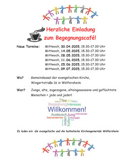 Junge, alte, zugezogene, alteingesessene und geflüchtete Menschen. Jede und Jeder ist herzlich Willkommen. Nächstes Begegnungscafé in Zusammenarbeit mit der kath. Gemeinde Christkönig.