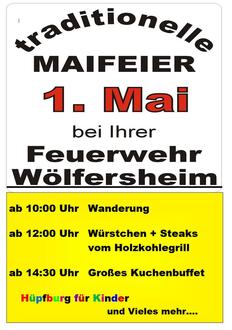 Zu unserer traditionellen Maifeier laden wir alle Mitbürgerinnen und Mitbürger auch in diesem Jahr wieder herzlich ein. Die Wanderung in die Wölfersheimer Gemarkung startet um 10 Uhr am Gerätehaus in der Seestraße 11. Pünktlich zum Mittagessen kehren wir an das Gerätehaus zurück, wo „Dick-Supp“ sowie Steaks und Würstchen vom Holzkohlegrill zur Stärkung auf uns warten. Zur Kaffeezeit lädt eine große Auswahl an selbstgebackenen Kuchen und Torten zum „Schlemmen“ ein. Kommen Sie vorbei und verbringen Sie ein paar schöne Stunden bei Ihrer Freiwilligen Feuerwehr Wölfersheim.