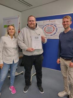 Christoffer (Mitte) mit seiner Lizenz zum managen