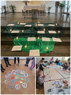 Zuhören, verzeihen, entschuldigen, versöhnen uvm. Anschließend wurden noch Friedensgebete gebetet und Friedenslieder gesungen. Zum Schluss bastelten die Kinder ganz bunte Peace-Zeichen aus Papptellern und verzierten sie z. B. mit Herzen und Blumen.