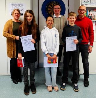 Kurz vor den Weihnachtsferien wurden die erfolgreichen Olympioniken von Schulleiter Olaf Bogusch mit einer Siegerurkunde ausgezeichnet; für den Förderverein der Wölfersheimer Schulen überreichte Christine Happ jedem ein Buchgeschenk. Wettbewerbsbetreuer Thomas Wilhelm Schwarzer beglückwünschte alle zu diesem bemerkenswert guten Abschneiden und wünschte den beiden Teilnehmerinnen an der Landesrunde viel Erfolg.