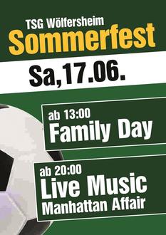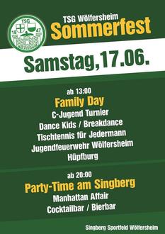 Am Samstag, den 17.06.2023 findet ab 13:00Uhr das Sommerfest der TSG 1847 Wölfersheim mit dem Motto „Family Day“ auf dem Gelände des Singberg-Sportfelds in Wölfersheim statt. Der Tag abgerundet wird ab 20:00Uhr mit Live Musik von „Manhatten Affair“.